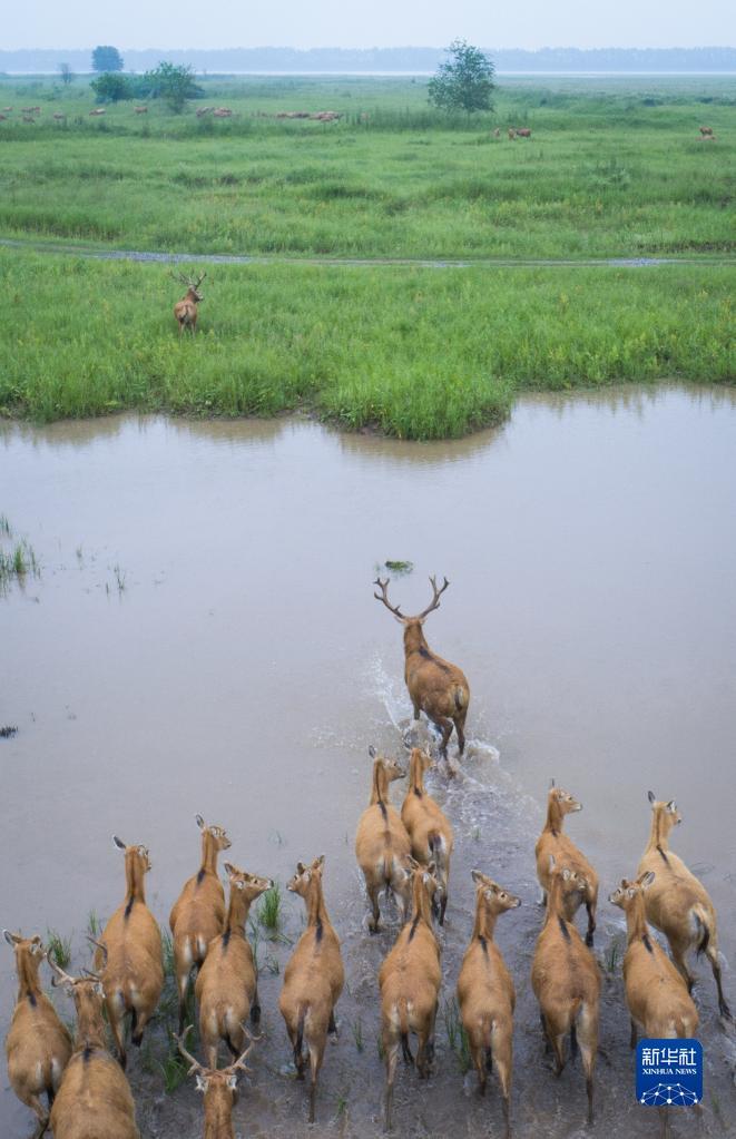 一群麋鹿在石首麋鹿国家级自然保护区内活动(2021年5月17日摄,无人机照片)。新华社记者 肖艺九 摄 顺江而下约30公里,是长江左岸兴发集团宜昌新材料产业园沿江码头,记者远远就看见了“共抓大保护,不搞大开发”的红字标语。近旁约1公里长的沿江景观带内,午饭后的人们正三五成群散步、聊天。飘落的银杏叶、弥漫的桂花香,让人倍感惬意。 “你说这里美不美?”园区职工宋桂生笑着搭话,“说我们的工厂像大花园,一点都不夸张吧?”宋桂生向记者介绍,这里曾是临江而建的化工厂房和货运码头,以前管道纵横、罐塔遍布,后来全部拆除搬迁,退让出来的800多亩土地栽上了树木花草。
