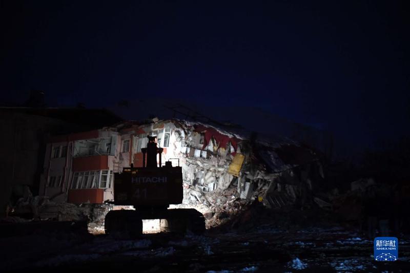 2月7日晚,在土耳其卡赫拉曼马拉什省南部的埃尔比斯坦地区,救援人员在一处地震废墟搜救。