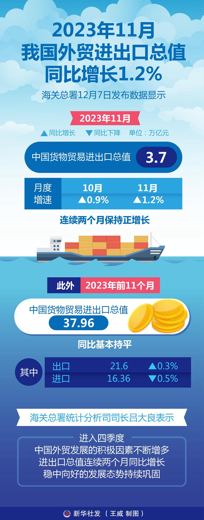 新华社北京12月7日电 题:外贸持续稳中向好,全年目标实现可期 新华社记者魏弘毅、林光耀 年终岁尾,中国外贸顶住压力,持续回稳。海关总署12月7日发布数据显示,继10月份我国外贸月度、累计增速双双转正后,11月单月进出口同比增速进一步扩大至1.2%,累计增速则与去年同期基本持平。 对此,海关总署统计分析司司长吕大良表示,进入四季度,我国外贸发展的积极因素不断增多,进出口总值连续两个月同比增长,稳中向好的发展态势持续巩固。