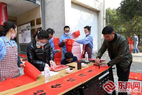 在福建华韵竹木有限公司工会,企业职工拿着一副副寓意喜庆、饱含祝福、充满吉祥的春联,你一嘴我一言开心地说道:“工会关心职工,不用出门,就能免费领到这么漂亮的春联啦,这个送春联活动非常好。”“往年都是去镇上赶集购买春联,书法老师手写的春联比外面买的春联更有年味!”“眼看就要过年了,我正准备上街去买副春联,没想到在这里能免费领到,真好看。”活动现场还有很多职工来到自己喜爱的书法家面前求字,不到三个小时的时间里,书法家们书写了百余副春联,营造出和谐吉祥的新春氛围。