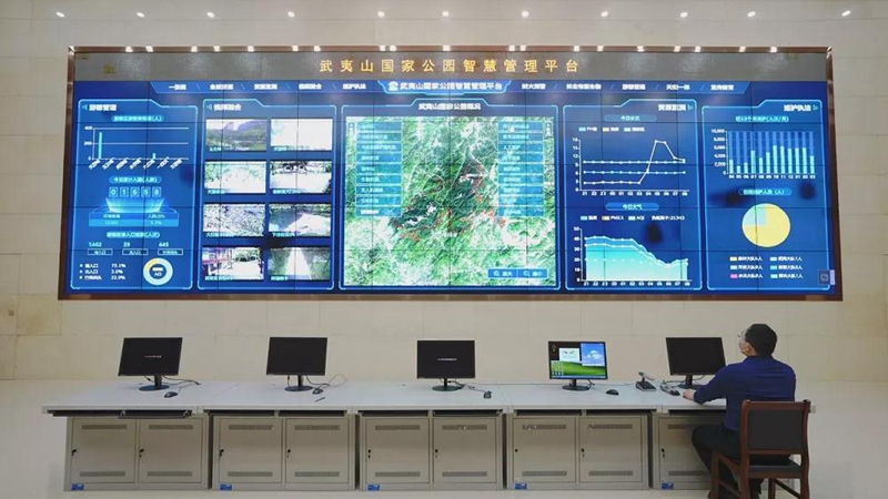 ▲武夷山国家公园智慧管理中心 武夷山国家公园智慧管理中心对公园范围内生物资源、生态环境要素等开展“天空地”一体化全方位全天候监测和服务。