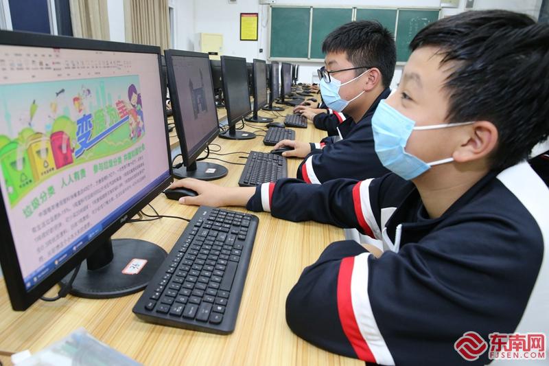 11月5日傍晚,武夷山市第一中学初中部信息兴趣小组的学生在制作垃圾分类网页。 邱汝泉/摄