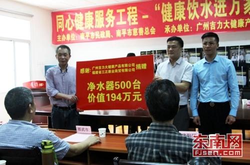 活动启动仪式上,广州吉力大健康产品有限公司董事长向南平市慈善总会捐赠500台净水器,并表示对安装的净水器提供终身免费售后服务。