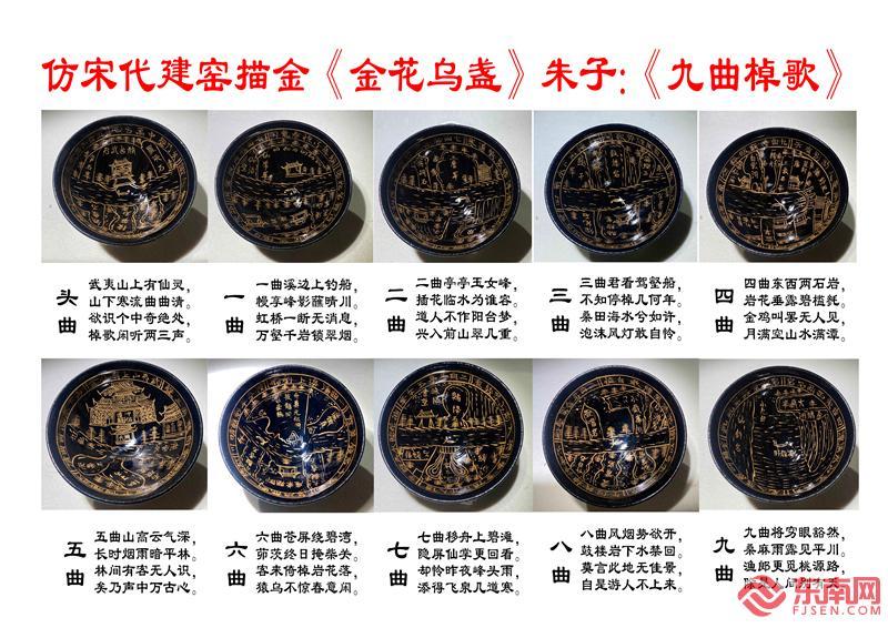功夫不负有心人,徐永生在经历了无数次失败后终于掌握了这门技术。2023年6月27日,一套用真金描绘朱熹《九曲棹歌》文图、仿宋代点茶器建盏——《九曲棹歌》金花乌盏被武夷山博物馆收藏。《九曲棹歌》是南宋大家朱熹携友人同游九曲溪时所作的一首七排诗,这首诗是历代文人骚客吟颂武夷诗中,最早概括描绘武夷九曲溪风貌的一幅长卷佳作,而九曲溪也因此作名扬天下。据考证,宋代建盏釉面就有纪录《九曲棹歌》诗歌主题的文图。