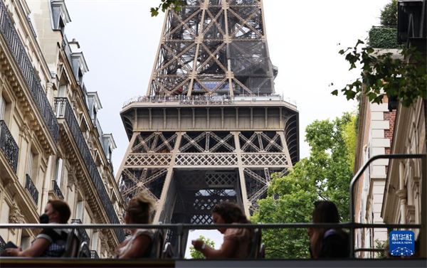 7月7日,一辆旅游大巴车经过法国巴黎埃菲尔铁塔。