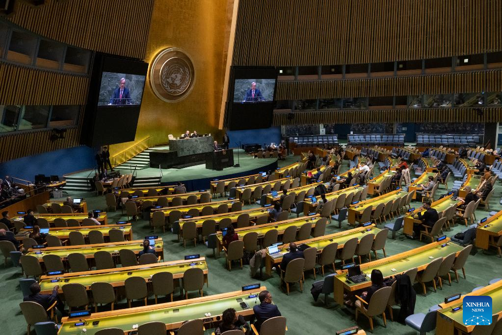 UN Secretary-General Antonio Guterres (at the podium and on screens) addresses a UN General Assembly event marking the International Day of Remembrance of the Victims of Slavery and the Transatlantic Slave Trade at the UN headquarters in New York, on March 27, 2023. Guterres on Monday called for fighting slavery's legacy of racism through education, which he said is "the most powerful weapon." (Eskinder Debebe/UN Photo/Handout via Xinhua)