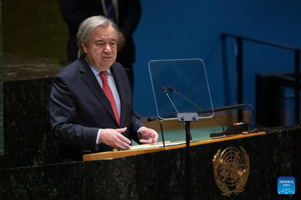 UN Secretary-General Antonio Guterres addresses a UN General Assembly event marking the International Day of Remembrance of the Victims of Slavery and the Transatlantic Slave Trade at the UN headquarters in New York, on March 27, 2023. Guterres on Monday called for fighting slavery's legacy of racism through education, which he said is "the most powerful weapon." (Eskinder Debebe/UN Photo/Handout via Xinhua)