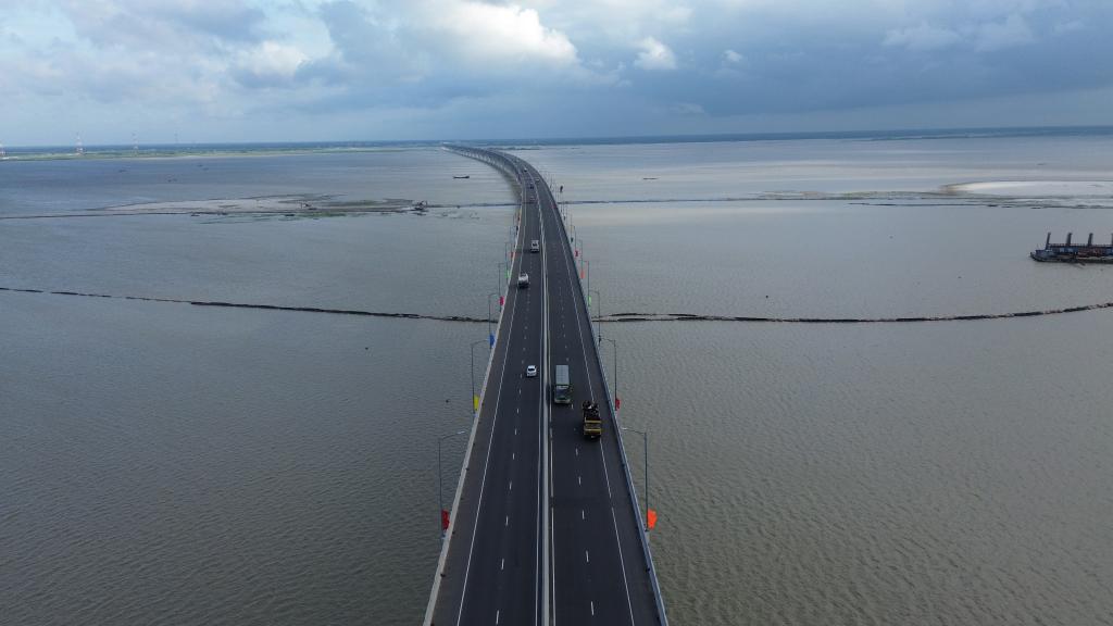 这是孟加拉国首都达卡西南约40公里处的帕德玛大桥(2023年6月25日摄)。孟加拉国最大桥梁项目——帕德玛大桥是连接中国及“泛亚铁路”的重要通道之一。(新华社发)
