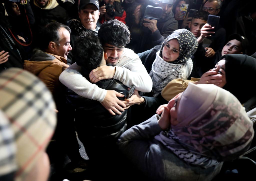 11月26日,在约旦河西岸城市拉姆安拉,获释的巴勒斯坦人与亲人团聚。新华社发(艾曼·诺巴尼摄)