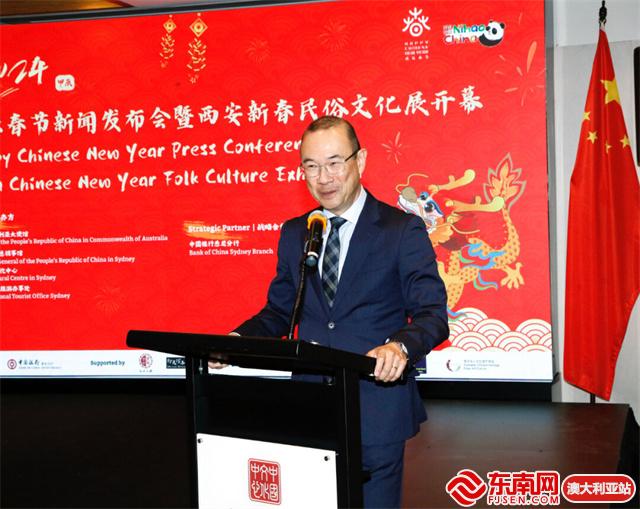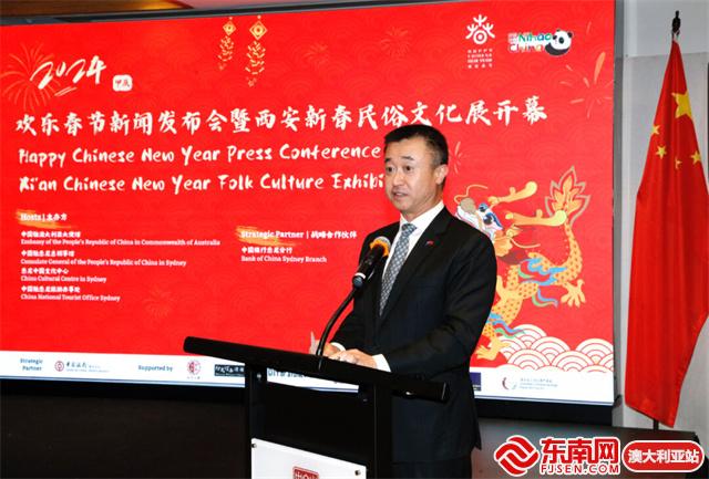 东南网澳大利亚1月26日讯(特约记者 一禾)当地时间1月25日,中国驻澳大利亚大使馆、驻悉尼总领事馆和悉尼中国文化中心联合举办2024龙年“欢乐春节”新闻发布会。由西安市文化和旅游局、悉尼中国文化中心共同主办的“欢乐春节·锦绣长安——2024西安新春民俗文化展”同时在悉尼中国文化中心隆重开幕,拉开全澳“欢乐春节”的序幕。中国驻悉尼总领馆代总领事王春生、中国驻澳大利亚大使馆公使衔参赞肖夏勇、悉尼市副市长郭耀文、澳中友好协会全国会长简·埃弗里特(JAN EVERETTE)、驻悉尼总领馆文化参赞王书羽、悉尼中国文化中心主任兼中国驻悉尼旅游办事处主任刘东、中国银行悉尼分行行长任立等中澳嘉宾和媒体80余人出席发布会暨开幕活动。