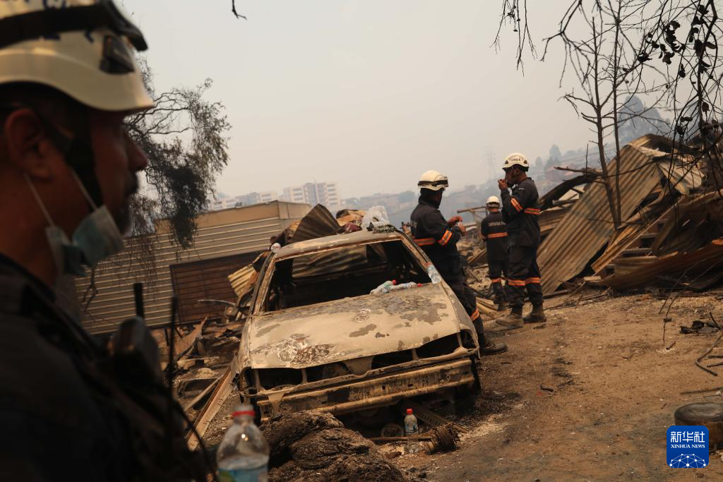 2月3日,在智利瓦尔帕莱索大区比尼亚德尔马市,救援人员查看在森林火灾中烧毁的房屋和汽车。新华社发