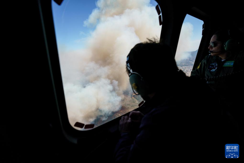 2月3日,智利总统博里奇(左)搭乘直升机在瓦尔帕莱索大区森林火灾受灾地区查看灾情。新华社发(智利总统府供图)