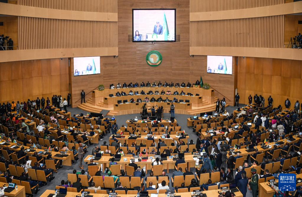 这是2月17日在埃塞俄比亚首都亚的斯亚贝巴拍摄的非盟峰会现场。非洲联盟(非盟)第37届首脑会议17日在位于埃塞俄比亚首都亚的斯亚贝巴的非盟总部开幕。此次峰会的核心议题聚焦地区安全局势、非洲大陆发展、非盟改革、提升非洲影响力等。新华社记者 李亚辉 摄
