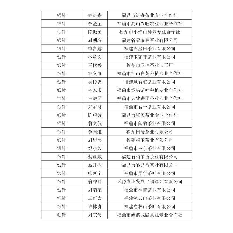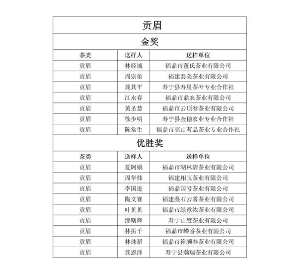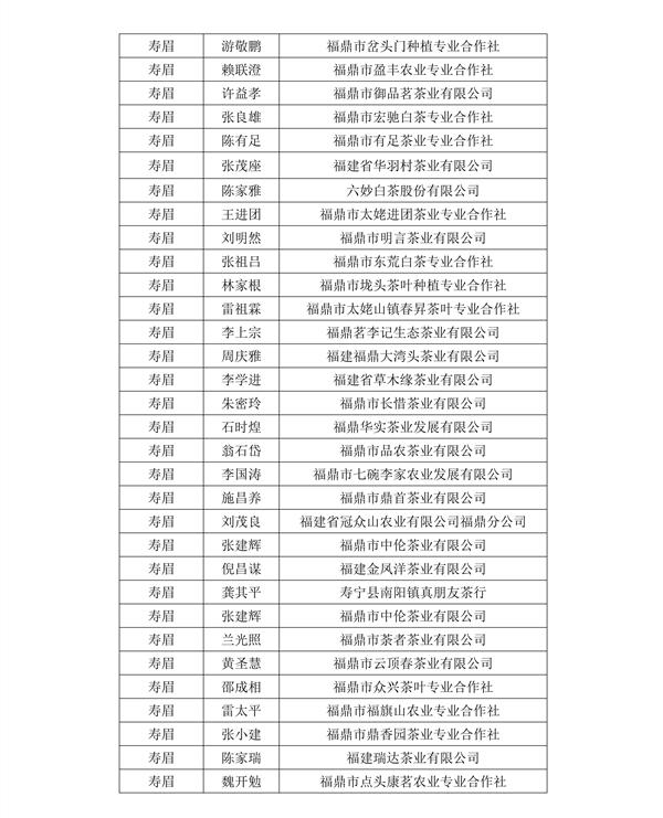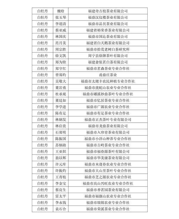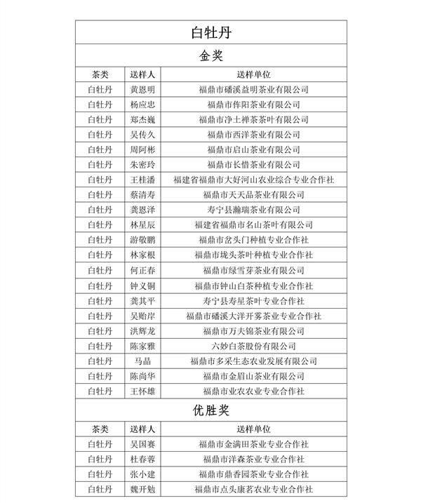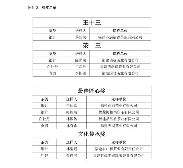 福建鼎白茶业有限公司王传意、福鼎梅相靖白茶有限公司梅相靖、福建品品香茶业有限公司林振传、福建天湖茶业有限公司林有希等人获得“最佳匠心奖”;福建省广福茶业有限责任公司林型彪、福建省漳平市璞玉茶业有限公司曾璞玉等人获得“文化传承奖”。