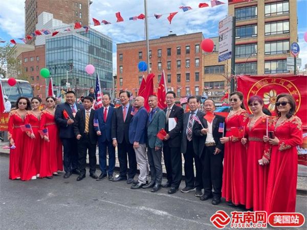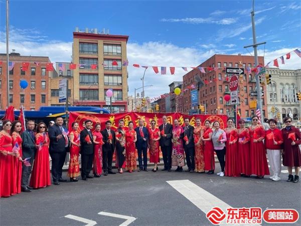 活动现场,歌声嘹亮,中美两国国旗插满街道,军乐队、腰鼓队都进行了精彩表演。中国驻纽约总领馆领事邢玉临、美国长乐南乡联合总会总顾问高秋华、美国福建商会会长林慈飞等也先后致词,活动由项静文、吴振文主持。