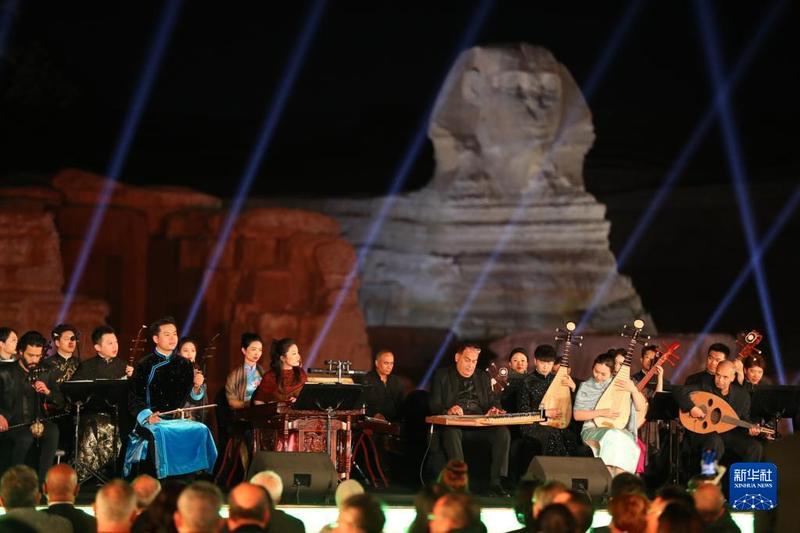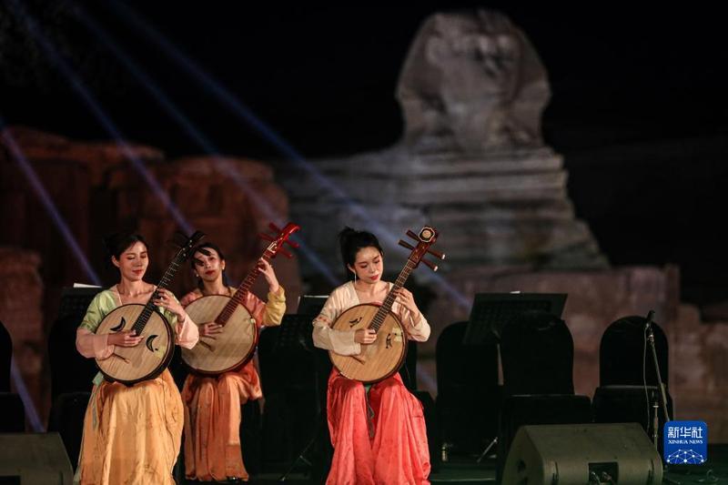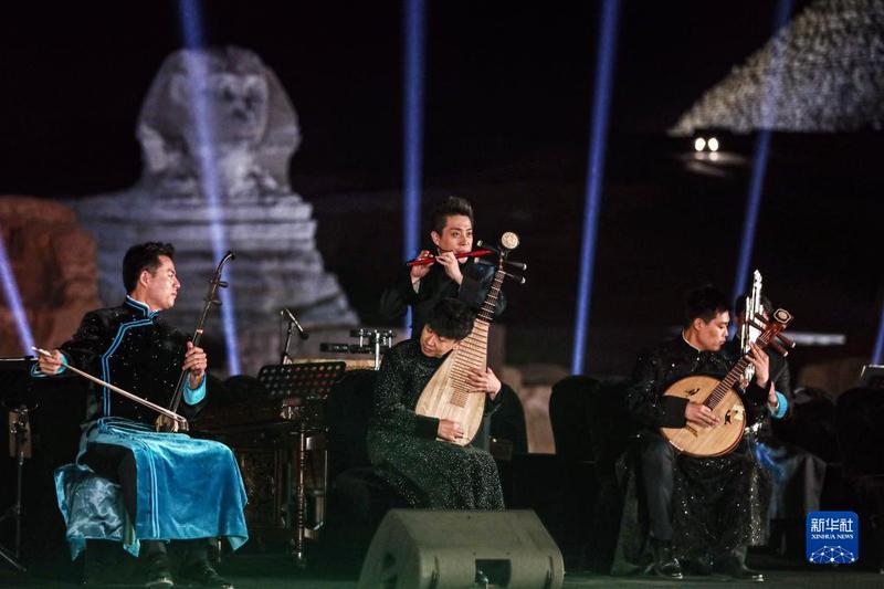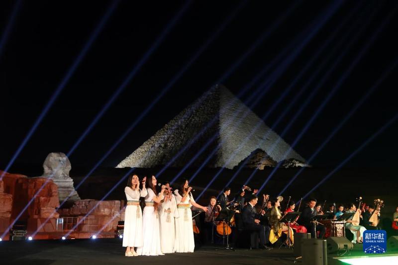 3日晚,由中国文化和旅游部、埃及旅游和文物部、中国驻埃及大使馆共同主办的中国-埃及民族音乐会在吉萨金字塔景区举办。中国中央民族乐团艺术家和埃及民族音乐家联袂为现场观众献上精彩演出。