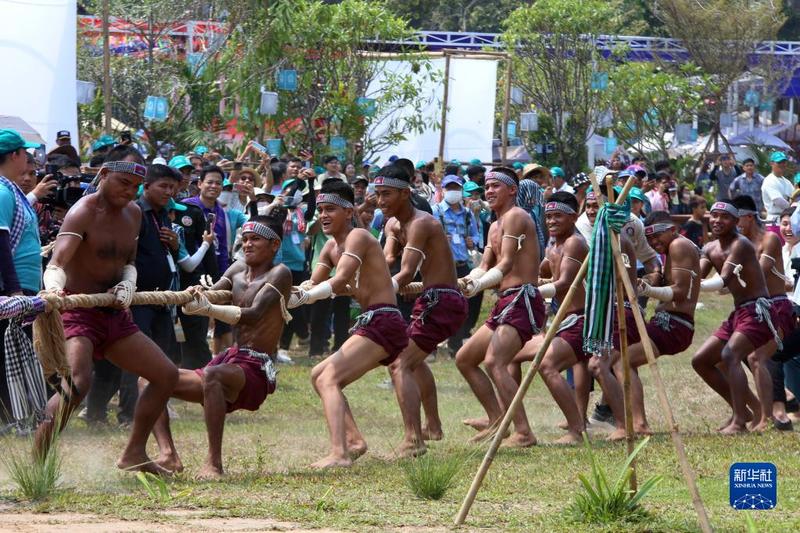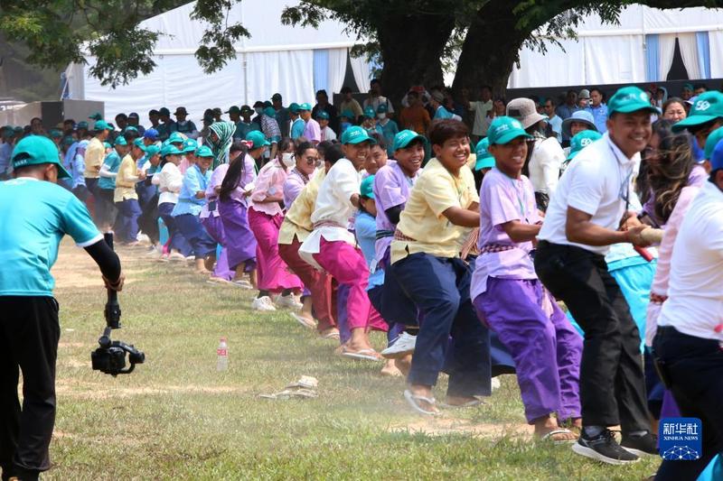 4月14日,在柬埔寨暹粒吴哥古迹内,人们在宋干节庆祝活动上参与传统拔河游戏。