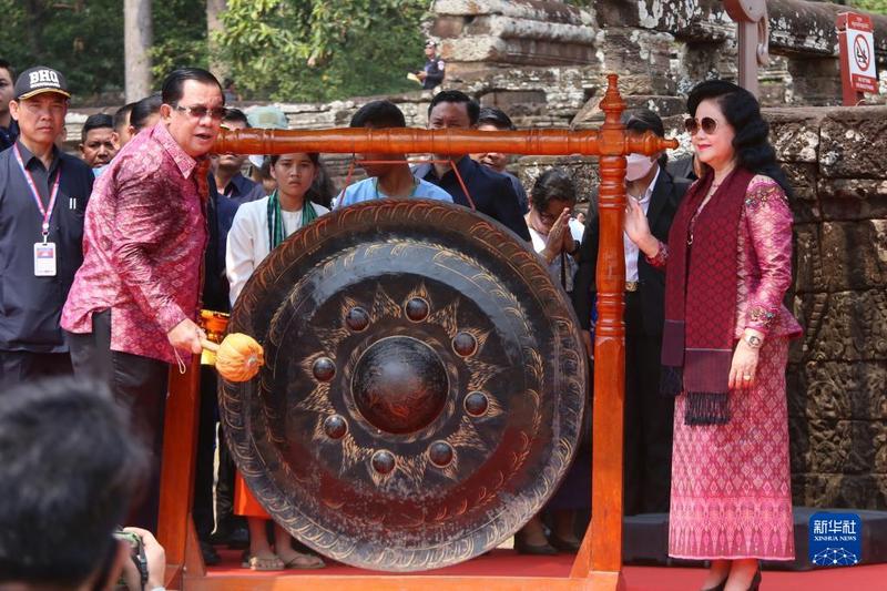 4月14日,在柬埔寨暹粒吴哥古迹内,柬埔寨首相洪森(左)在宋干节庆祝活动开幕式上敲锣。