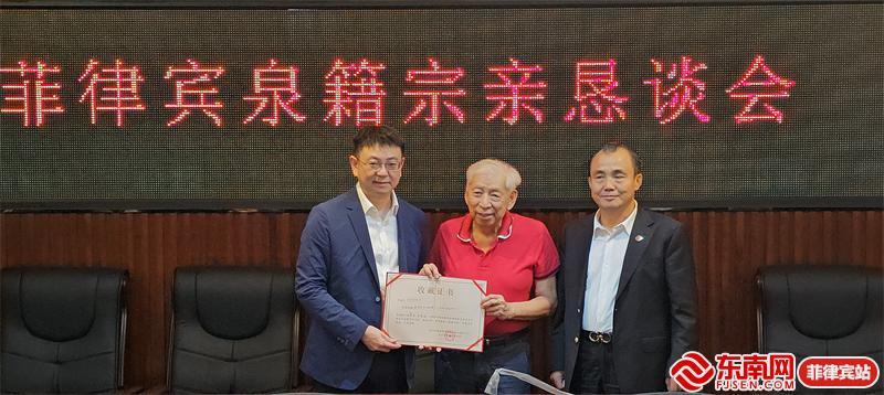 恳谈会上知名侨领、菲华诗人李淡之子李平原先生在会上捐赠《菲律宾李氏家谱》《李淡诗词手书》等族谱和文献,泉州代表团团长王斯诚向李先生颁发了收藏证书、赠送了纪念品。