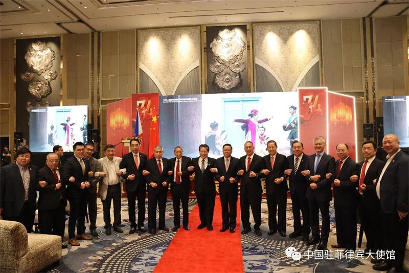 2023年9月21日,中国驻菲律宾大使馆在马尼拉举行招待会,庆祝中华人民共和国成立74周年。菲律宾副总统兼教育部长莎拉·杜特尔特用中英双语发表视频致辞,菲代理外长多明戈、财长乔克诺、贸工部长帕斯卡尔,参议院少数派领袖皮门特尔、参议员埃斯库德罗,众议院少数派领袖利巴南、秘书长维拉斯科、界别党联盟秘书长妮基、外委会主席阿里纳斯、多数派副领袖嘉琳,菲军副参谋长盖尔兰,菲总统中国事务特使许智钧、颜杰奇,阿尔拜省省长拉格曼、卡加延省省长曼巴、卡坦端内斯省省长约瑟夫,政府有关部门负责人,以及菲华商联总会理事长施东方、菲华各界联合会主席蔡永宁、菲律宾中国商会会长侯世练等华社侨领和社会各界友好人士,其他国家驻菲使节、国际组织代表和驻菲中资机构、外派教师、留学生、媒体智库人士近千人出席。