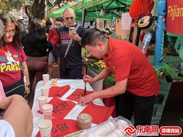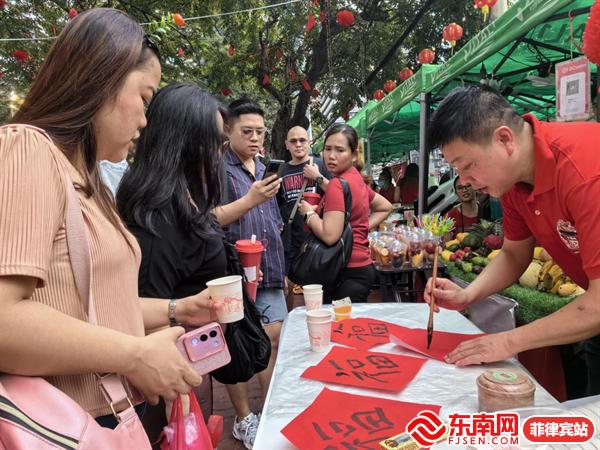 东南网菲律宾站现场布置了“福”文化摊位,呈列摆放了龙年公仔、福茶、茶器、“福”字等,并进行书法创作,吸引了众多民众关注,共享“福”文化乐趣。