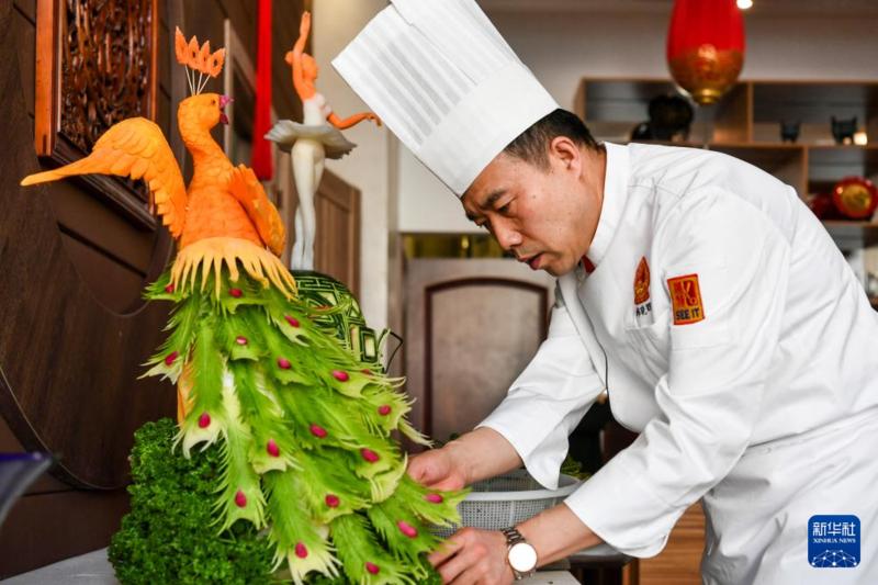 2月20日,厨师在俄罗斯莫斯科举行的“珍奇辽味”走进俄罗斯活动上制作“孔雀迎宾”食雕。新华社记者曹阳摄