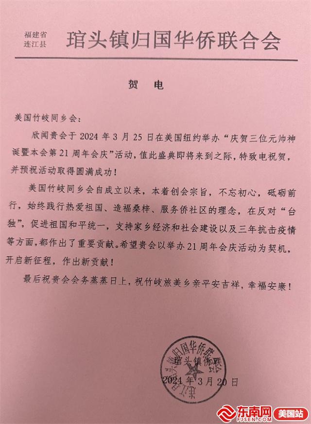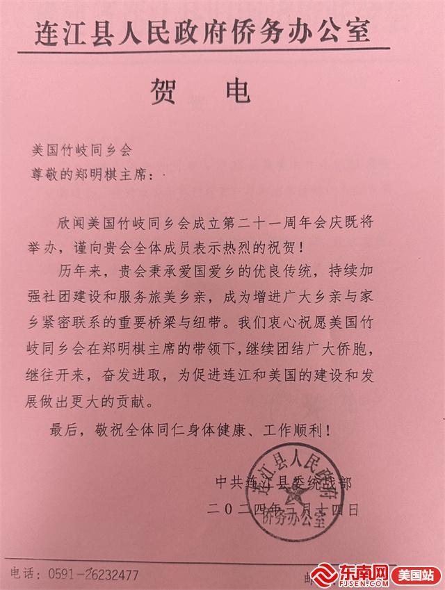 活动收到来自中华人民共和国驻纽约总领事馆、中国人民政治协商会议全国委员会港澳台侨委员会办公室、中华全国归国华侨联合会、中国致公党福建省委员会、连江县人民政府侨务办公室、连江县归国华侨联合会、连江县琯头镇归国华侨联合会等发来的贺信。