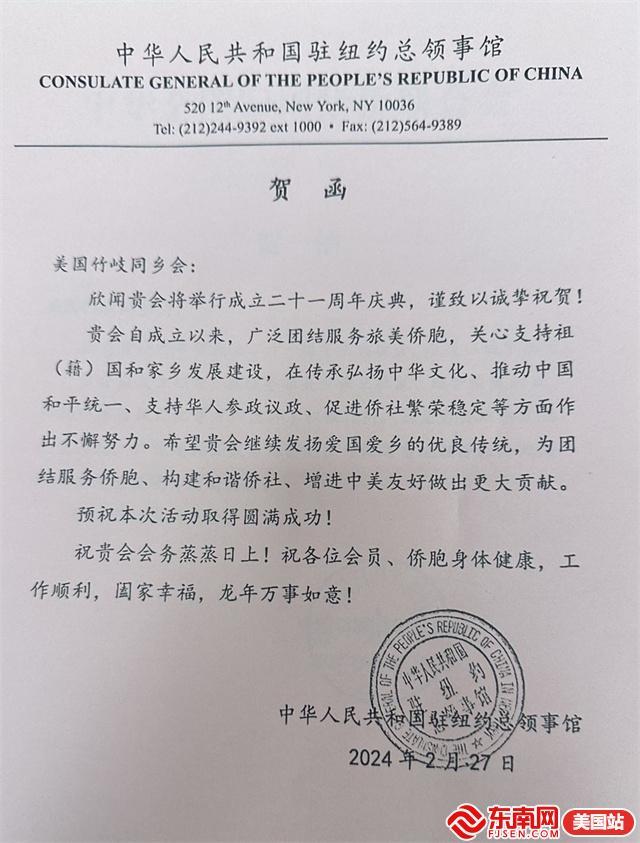 中华人民共和国驻纽约总领事馆贺信