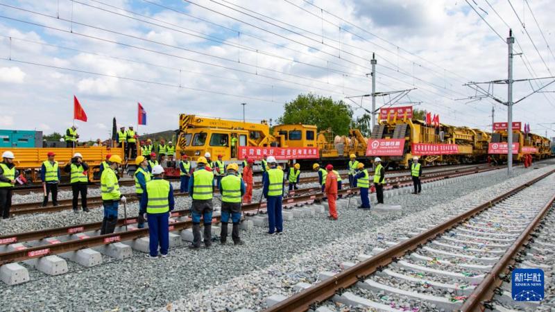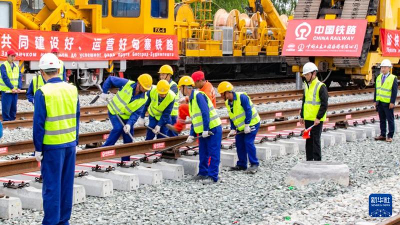 4月25日,在塞尔维亚北部城市巴奇卡托波拉,匈塞铁路项目施工人员进行匈塞铁路轨道合龙工作。