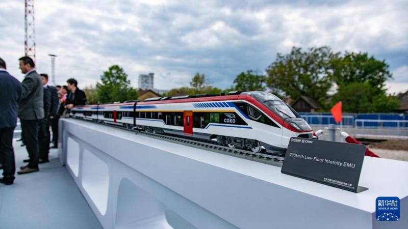 这是4月25日在塞尔维亚北部城市巴奇卡托波拉举行的贯通仪式现场拍摄的列车模型。