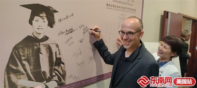 美国天普大学法学院副院长桑国亚(左一)在展板上签名留念