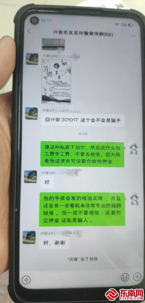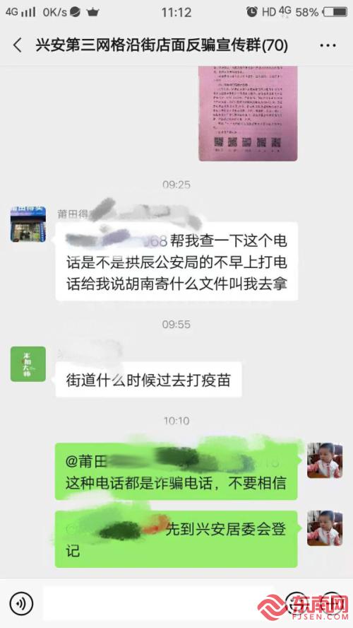 网格员劝阻杨女士的聊天记录 东南网莆田4月13日讯(本网记者 江瑞鑫 通讯员 李秀荔 文/图)随着网络科技、通讯技术发展迅速,犯罪分子的诈骗手法不断翻新,冒充“公检法”让你取快递、网络兼职平台让你“一夜暴富”......诈骗套路层出不穷,近期,莆田城厢区网格员连续两天成功阻止了三起电信诈骗案件。 公安局让你取快递?是诈骗! 4月9日下午,龙桥兴安社区瑞龙巷的杨女士接到一个来自河南的陌生电话,称杨女士有一个快件在莆田市公安局待领取,杨女士想起辖区网格员经常在朋友圈发布的反诈骗事例,便立即联系网格员黄碧兰咨询真伪。 网格员黄碧兰意识到这是诈骗电话,立即提醒杨女士切勿相信。为确保安全,黄碧兰随后来到杨女士家中,当面提醒杨女士谨防被骗。杨女士庆幸道:“幸好问了你们,不然就被骗了!” 4月10日,在龙桥兴安社区学园中街经营店铺的陈女士在社区群内告知片区网格员,称今早接到一通电话,对方自称是拱辰派出所,有一份湖南寄来的文件让她去领取。陈女士联想到近期网格员入户走访时宣传的电诈知识,感觉该“剧情”十分符合其中的“冒充公检法”类型,于是立即联系网格员求证。 果不其然,网格员立即告知陈女土这是典型的“冒充公检法”诈骗手段。陈女士的判断是正确的,没有落入诈骗分子的圈套。