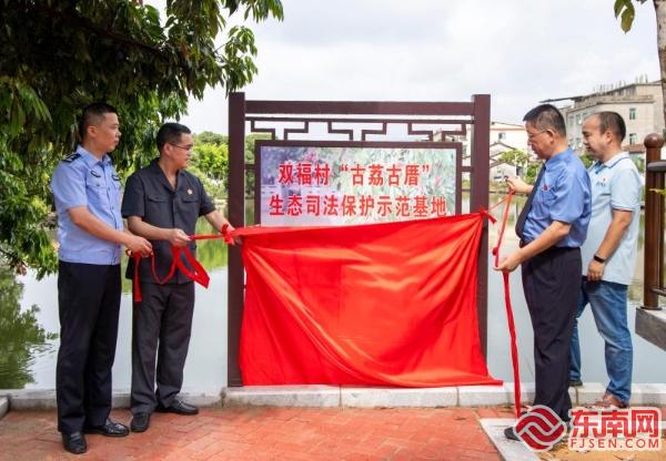 揭牌仪式 东南网莆田8月15日讯(通讯员 蔡林莉 徐滨 文/图)莆田,因盛产荔枝,又称“荔城”,目前莆田市现有树龄达500年以上的荔枝古树32棵,而双福村拥有其中10棵树龄超700年的荔枝古树,是莆田市古荔枝资源主要集中地。 近日,莆田市涵江区人民法院联合区检察院、市公安局涵江分局、白塘镇人民政府在白塘镇双福村开展“古荔古厝”生态司法保护示范基地揭牌仪式暨普法宣传活动,这是莆田市首个古荔枝树资源集中地的生态司法保护示范基地。 现场,以设立古荔古厝生态司法保护示范基地为契机,活动单位为双福村的孩子们带去一堂生动绿色的环境保护法治课。法官、检察官姐姐通过简洁易懂的语言、生动详实的案例,简明扼要解释了古厝古树、文物保护法律知识、生态保护的政策规定等,引导孩子们积极参与古荔古厝保护,凝聚保护生态环境、历史人文之美的共识。