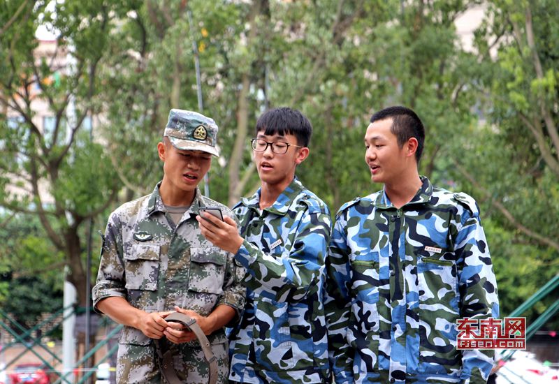 在泉州师范学院内,两名新生与教官一起唱歌。东南网记者陈培源 摄