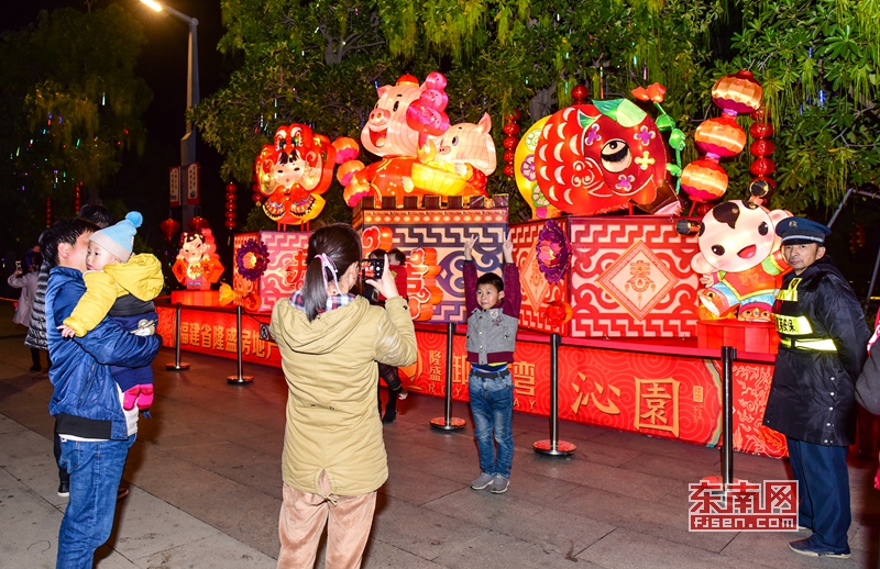 在海丝公园内,特色花灯深受市民喜爱,不少人拿起手机合影。东南网记者 林婕 摄
