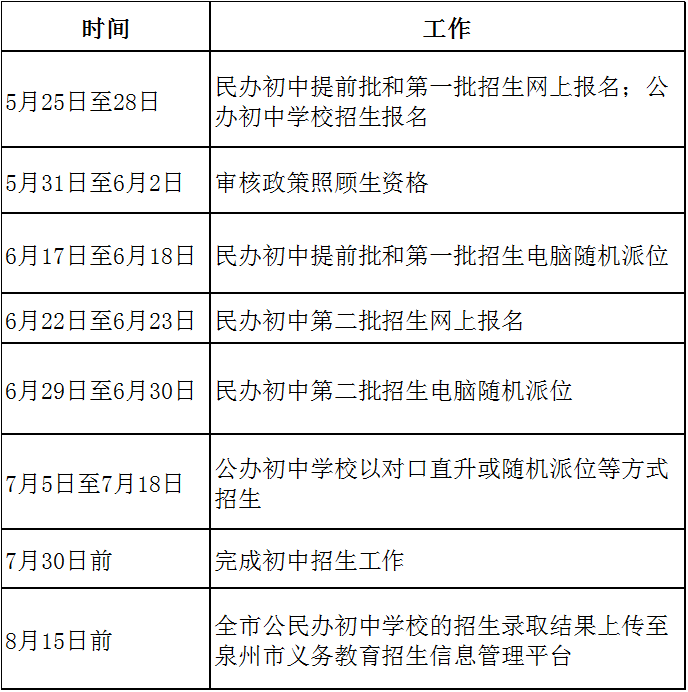 二、严格管理程序,保障规范招生 全面落实初中免试就近入学规定要求,公民办初中学校招生纳入审批地统一管理,由教育主管行政部门科学确定招生范围、核定招生计划,实行平等对待、同步招生、规范录取。 (一)科学确定招生范围和核定招生计划。坚持义务教育免试就近入学原则,立足新型城镇化背景下户籍制度改革、租赁住房改革试点等,调整和优化中学教育布局,加快教育基础设施建设,确保新增人口平等享受基本公共教育服务,严防产生新的大班额和大校额。招生片区划定后应在一段时期内保持稳定。招生片区划定或调整,要充分评估和论证,广泛听取各方意见,凝聚共识,确保平稳;鼓励有条件的地方稳妥推进多校划片招生改革试点。 民办初中学校原则上在县域范围内招生;属于市教育局审批或寄宿制学校的,可在学校申请并经我局批准扩大的范围内招生,但一般不实行全市范围招生。2021年泉州市民办初中招生计划和范围(附件1)。 各县(市、区)教育行政部门要切实落实消除大班额规划,初中每个班级控制在50人以内,确保初中起始年级不出现56人及以上大班额,51-55人班额比例按规定控制在10%或15%以内。对辖区内可能新增大班额的学校进行预警提示,特别要严格控制存在大班额和大校额学校的招生计划,确保不产生新的大班额。学校须严格按照批准的招生计划实施招生,不得擅自突破招生计划。 要增强公办初中学校布局与资源供给,坚决防止将义务教育的责任推向市场。各县(市、区)要严格控制公民办招生比例,民办初中招生规模占比偏高的地方,公办初中教育资源相对不足的县(市、区),政府和教育行政部门可通过与民办学校签订“委托协议”购买服务方式,委托当地办学条件较好、办学质量较高的民办学校承担部分义务教育责任,招收辖区内小学毕业生免试就近入学,以及辖区内符合条件的随迁子女接受义务教育,该部分招生名额纳入本县(市、区)公办初中学校招生计划,并向我局报备与公开发布,接受社会监督。 市直学校初中招生入学工作纳入所在地县(市、区)教育行政部门统筹管理,具体招生方案由所在地县(市、区)教育行政部门制定并报我局批准同意后公布实施。2021年,泉州第一中学(学府校区)、泉州培元中学、泉州第五中学(桂坛校区)面向鲤城区计划招收分别为600人、600人、1300人;泉州第五中学(桂坛校区)面向丰泽区计划招收100人;泉州第五中学(城东校区)计划招收300人;泉州第一中学(东海校区)计划招收800人;华大附中计划招收90人。泉州外国语学校(学府校区)、泉州实验中学(圣湖校区、滨江校区)、仰恩大学附属中学等民办学校的招生计划数见附件1。 (二)科学确定初中招生方式与程序。各县(市、区)教育行政部门要坚持义务教育免试就近入学原则,健全公平的入学管理机制,科学制定初中招生入学工作的实施方案,明确初中招生划片入学模式、升学流程及入学办理方式。公办初中学校实施初中单校划片对口直升或初中多校划片电脑随机派位录取等方式招生,采取登记入学或书面通知入学。民办初中学校招生纳入审批地统一管理,与公办初中学校同步报名招生,民办学校报名人数未超过招生计划数的,学校应一次性全部录取;当报名人数超过招生计划数的,全部实行电脑随机派位录取。 全市民办初中学校各批次招生都须在泉州市义务教育招生信息管理平台上实行统一网上报名。民办学校与公办学校同步进行报名招生,允许学生兼报。 公民办初中学校招生的电脑随机派位录取由教育行政部门统一组织和制定具体操作规则,电脑随机派位录取须有公证机构参加,并组织公民办中小学校校长、小学毕业生家长等代表及新闻媒体参加,全程接受社会监督,派位结果实时向社会公开,由派位结果的录取学校办理录取手续,学校不得劝退或变相劝退已录取的学生。公民办初中学校招生的电脑随机派位录取结果一经产生,任何学校和个人不得擅自改变派位结果。 民办初中学校面向本县(市、区)招生电脑随机派位录取由学校的教育主管行政部门负责组织;民办初中学校面向泉州市中心市区(指鲤城区、丰泽区、洛江区、泉州开发区,下同)和面向外县(市、区)的招生电脑随机派位录取由泉州市教育局负责牵头组织;公办初中学校实施初中单校划片对口直升或初中多校划片电脑随机派位等录取方式招生的,由学校所在县(市、区)教育局负责组织。 民办九年和十二年一贯制学校小学部毕业生原则上应按学生或家长意愿优先直升本校初中部,当小学部毕业生意愿直升人数大于初中招生计划数时,采取电脑随机派位方式录取;当小学部毕业生意愿直升人数未超过初中招生计划数时,应一次性全部录取。小学部毕业生录取后仍有剩余招生计划面向外校的,按本实施方案的有关民办初中学校的招生方式和程序组织录取。各县(市、区)教育行政部门须于2021年5月17前,汇总区域内有小学毕业生的民办九年和十二年一贯制学校名单(随附佐证材料),盖章同意后送至市教育局中教科。 未实施一贯制办学的民办学校,目前在读学生当年小学入学时,经教育主管行政部门同意,学校当时已向家长承诺可按一定比例直升本校初中部的,相应年级可按相应比例校内直升,但必须按照上述一贯制学校的招生录取办法并纳入提前批。该部分民办学校须于2021年5月17日前,将学校所承诺内容(须附