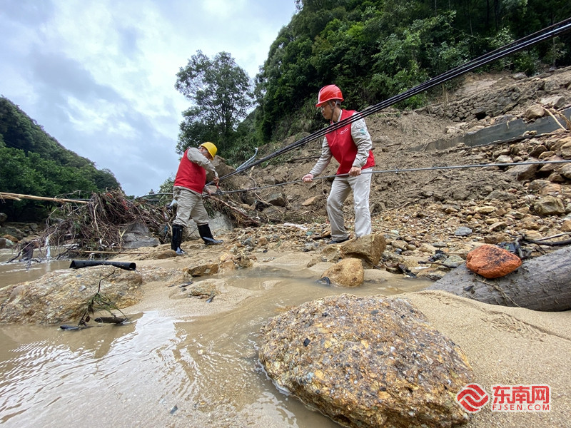 供电所抢修队员对冲刷到河道里的受损物资进行拆卸回收。刘文宏 摄