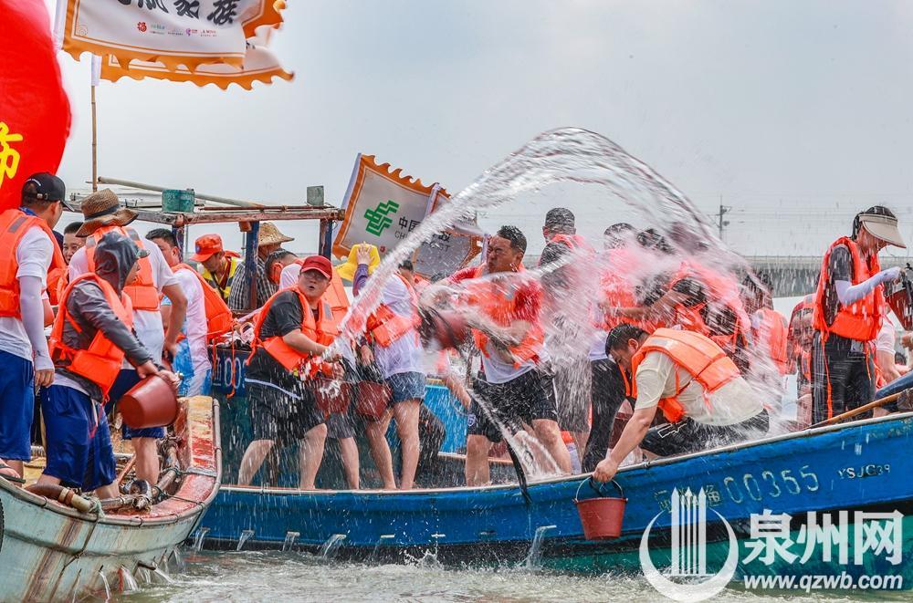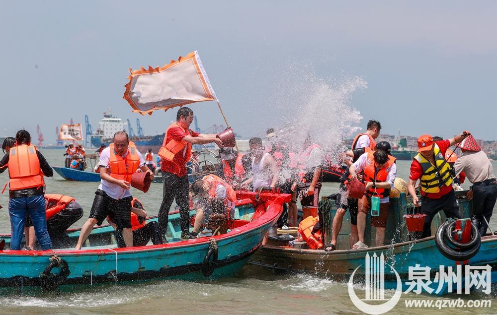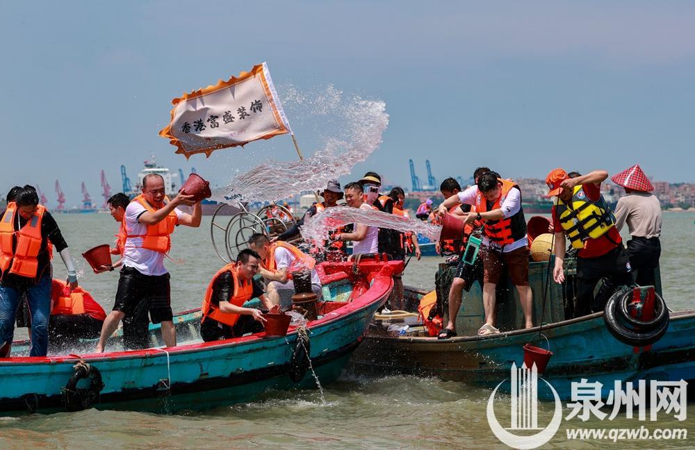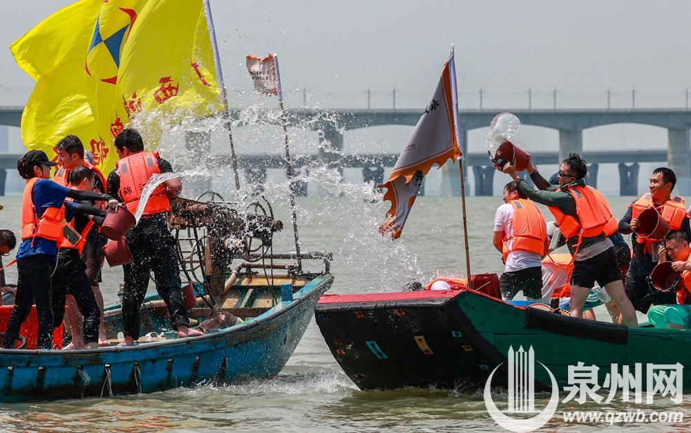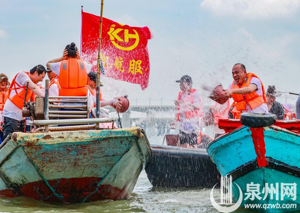 6月22日中午,“我们的节日·端午”——第十七届闽台对渡文化节暨蚶江海上泼水节开幕式在石狮市蚶江镇锦江外线举行,来自两岸的民众、游客齐聚于此,参与或观看这泉州别样的端午民俗——海上泼水活动。这也是泉州申遗成功后,首次在泉州世界遗产景点林銮渡旁的海域举行非遗项目,海上、陆上等配套活动为八方来客奉上一场文化盛宴。 (陈英杰 陈小阳 摄) 海上泼水活动