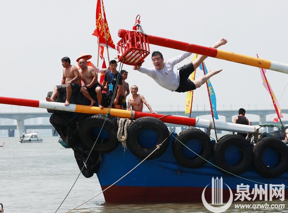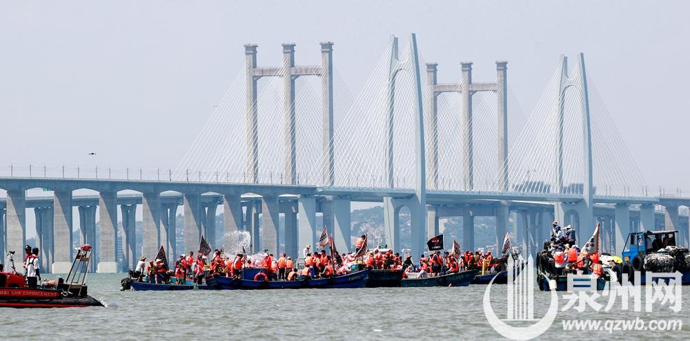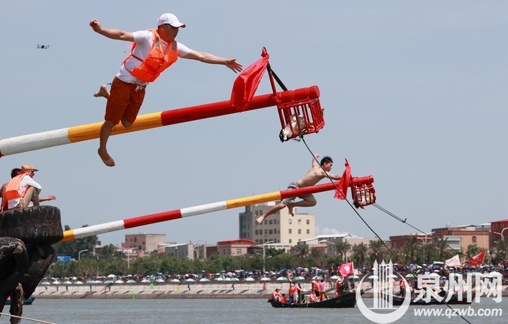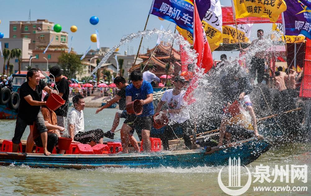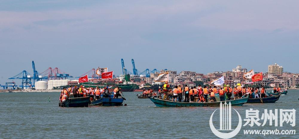 6月22日中午,“我们的节日·端午”——第十七届闽台对渡文化节暨蚶江海上泼水节开幕式在石狮市蚶江镇锦江外线举行,来自两岸的民众、游客齐聚于此,参与或观看这泉州别样的端午民俗——海上泼水活动。这也是泉州申遗成功后,首次在泉州世界遗产景点林銮渡旁的海域举行非遗项目,海上、陆上等配套活动为八方来客奉上一场文化盛宴。 (陈英杰 陈小阳 摄) 海上泼水活动
