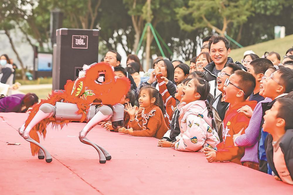 23日,在福清市石竹山风景名胜区,游客与智能机器狗互动。谢贵明 摄