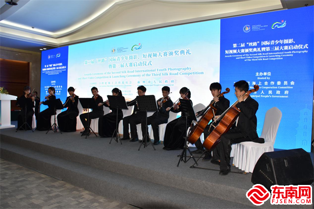 合影 活动现场,来自福州格致中学的弦乐团演奏了《莫扎特嬉游曲K.136》,展现了福州市青少年的国际风采;播放了福州友城澳大利亚霍巴特市青少年舞蹈表演视频,展示了霍巴特和福州的浓浓情谊;现场宣布了第二届“丝路”大赛获奖名单,并为获奖选手颁奖;播放了优秀摄影作品和短视频作品合辑,回顾了各国青少年的参赛作品;随后,领导和嘉宾参观了优秀作品展及“福”文化展,感受“丝路”文化的璀璨和深厚的“福”文化底蕴。