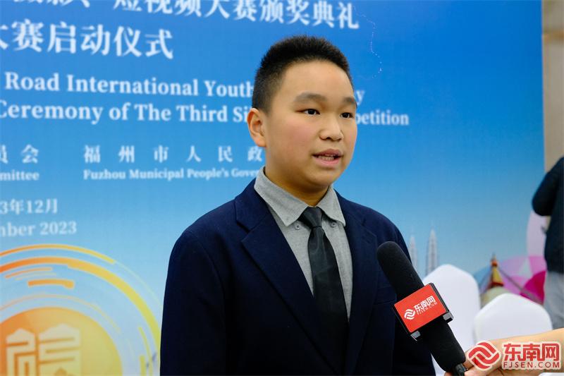 来自福州的张啸凡接受采访 来自福州的张啸凡平时喜欢去烟台山走走、逛逛,特别喜欢烟台山的夜景。他表示,很荣幸有机会通过影像作品宣传福州的文化瑰宝,希望能把福州的文化精神传承下去,这是青少年的责任,也是使命。他希望“丝路”大赛越办越好,也期待有更多的青少年加入大赛,一起保护好世界文化遗产。