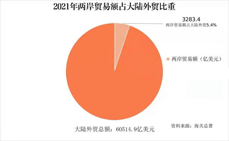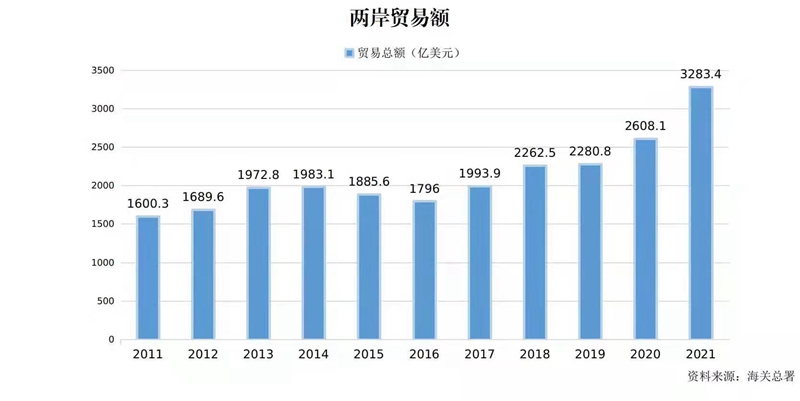 第一,两岸贸易大幅增长。据海关总署统计,2011年两岸贸易额为1600.3亿美元,2021年两岸贸易额增长至3283.4亿美元,10年间两岸贸易额翻了一番。两岸贸易额占大陆外贸的比重从2011年的4.4%增长至2021年的5.4%增长了1个百分点。据台湾方面统计,两岸贸易额占台湾外贸比重从2011年的28.6%增长至2021年的33%,增长4.4个百分点。大陆稳居台湾地区最大出口市场和最大贸易顺差来源地。
