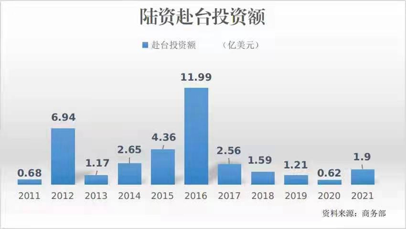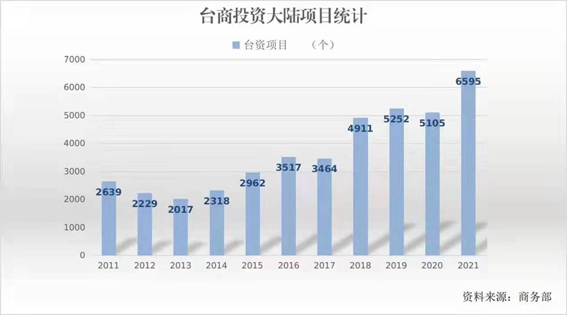 第二,台商对大陆投资稳定增长。据商务部统计,2011年共批准台商投资大陆项目2639个,2021年为6595个。截至2021年底,台商投资大陆项目共计123781个,实际投资额713.4亿美元。10年来,新批准台资项目数、吸引台资金额不断增加,充分表明台商持续看好大陆巨大内需市场、完备产业体系、强大生产制造能力和广阔发展前景。相较之下,由于民进党当局对大陆企业赴台投资不断设置新障碍,截至2021年底,陆资赴台投资额小幅增长,总额仅为37.1亿美元。