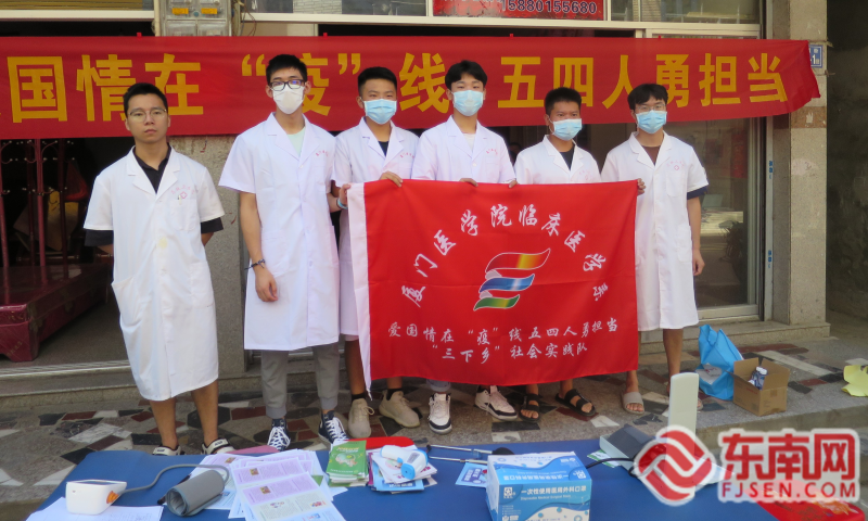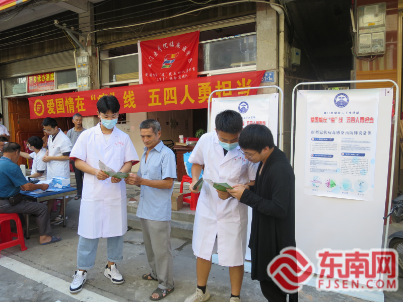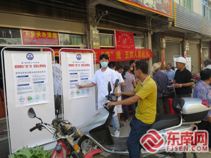 2020年8月3日-8月9日,厦门医学院“爱国情在‘疫’线,五四人勇担当”实践队展开了为期7天的暑期“三下乡”社会实践活动,运用“线上+线下”模式分阶段开展疫情防控宣传,为战胜疫情贡献力量 2020年8月3日-2020年8月7号,实践队响应特殊时期的防疫要求,探索“互联网+社会实践”新模式,通过直播、录播以及制作互动H5(微信PPT,一种可以在移动端上呈现的传媒载体)等方式进行云宣讲,并得到了霞拔村村支书林基钟的支持,与村干部一起在霞拔村各个微信群中转发宣传,配合实践队的向广大人民群众传达有关疫情的基本知识和日常生活疫情防控小贴士。除此之外,实践队还介绍了许多有关基本急救知识以及急救物品的使用,皆取得了可观的成效,收获村民们的一致好评。 2020年8月8日-2020年8月9日,实践队积极响应疫情防控主题,采用线下实地宣讲的方式,向福建省福州市永泰县霞拔乡霞拔村的居民传达了疫情防控精神与最新要求,和当地卫生院协助配合,与村民们一同落实当地卫生院提出的符合该地实际情况的疫情防控要求。
