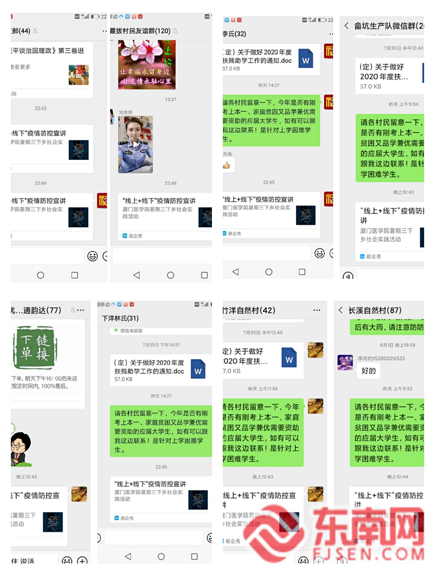 图1微信群宣传截图 Day1—厦医学子实地宣讲助抗疫 8月8日上午十点,实践队抵达了环境优美,空气清新,民风淳朴的霞拔乡霞拔村,在与当地卫生院负责人取得联系之后,卫生院热情地接待了实践队,表示会积极配合实践队的工作,并提供了宣讲所需的易拉宝、桌椅、疫情防控宣传手册,于卫生院附近设点宣讲。在实践队前期布置点位之时,附近热情的村民们就积极地向我们提供帮助,告知各自的亲朋好友前来参与本次防控宣讲活动,为实践队开展接下来的活动打下良好基础。 宣讲过程中,队员们采用亲和的语气,通俗易懂的词汇向村民们介绍本次新冠肺炎疫情的范围性、致病性、严重性,包括什么是冠状病毒、如何预防新冠病毒感染、如何正确佩戴口罩等常见的问题,并介绍了此次疫情的抗疫英雄个人事迹,例如钟南山院士、李兰娟院士、张文宏主任等。在此过程中,实践队与村民们积极互动,耐心解决村民们的困惑,通过张贴的海报也让村民们补充了解了更详细的疫情防控知识,以此来进一步提高他们对疫情防控的认识。 在宣讲结束之际,实践队为村民们每人分发了疫情防控手册以及免费的口罩,当天的活动受到村民们的高度赞扬和好评。同时,实践队告知了第二天的义诊时间和地点,村民 们纷纷表示会积极参与。