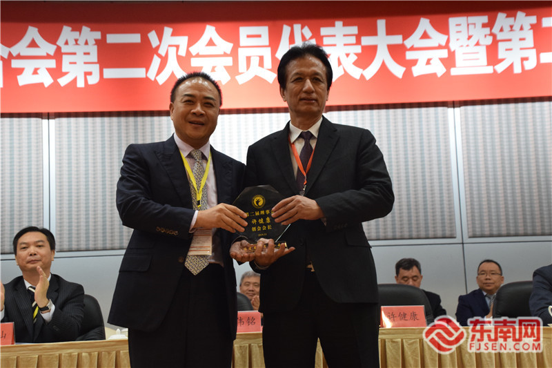 福建省侨商会第二届会长邱伟铭(左)向第一届会长许健康(右)颁发创会会长委任状。