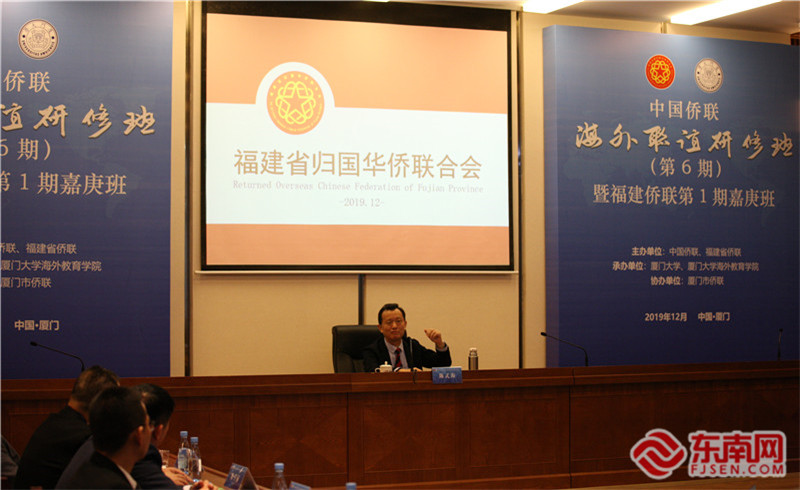 中国侨联第六期海外联谊研修班暨福建侨联第一期嘉庚班开班仪式现场 唐哲文 摄 东南网12月20日讯(本网记者 陈佳丽 通讯员 唐哲文)12月19日,中国侨联第六期海外联谊研修班暨福建侨联第一期嘉庚班在厦门大学开班,来自菲律宾、法国、美国、澳大利亚等36个国家和地区的60余名闽籍侨社骨干参加研修。 本次研修班由中国侨联、福建省侨联主办,厦门大学、厦门大学海外教育学院承办,厦门市侨联协办。中国侨联副主席、福建省侨联主席陈式海,中国侨联联谊联络部副部长桑宝山出席开班式。厦门大学海外教育学院副院长耿虎主持开班式。 本次研修班邀请了中国侨联、国家外交部领事司和厦门大学相关负责人和专家学者授课,课程内容涵盖中国外交思想、文化传播方式、台海局势、中华礼仪、“一带一路”政策解读等,并将带领学员赴上海开展实践学习,了解中国高新前沿科技发展情况。 据耿虎介绍,本期研修班旨在深化海外侨领对中国国情的认识,提升海外侨领发展社团的本领,增强他们在海外讲好中国故事的能力,同时让学员们进一步感受陈嘉庚先生爱国之深切,兴学之坚毅,品格之高尚,使他们在嘉庚精神的感召下,做中外文化的传播者、民间外交的践行者和实现世界梦的推动者。 开班仪式上,受中国侨联主席万立骏的委托,桑宝山代表中国侨联对远道而来的学员们表示热烈欢迎。他说,福建是中国的一大侨乡,闽籍侨胞在参与家乡建设、服务国家发展大局、促进中国和平统一、推动中外交流合作中发挥了独特作用,书写了爱国爱乡、侨心报国的动人篇章。他希望大家珍惜机会,认真学习,进一步提升自身知识和能力水平,助力中国发展,做民族复兴的贡献者;传承奋斗精神,做中国良好形象的塑造者;弘扬中华文化,做中外友好的促进者;发扬光荣传统,做爱国主义的传承者。
