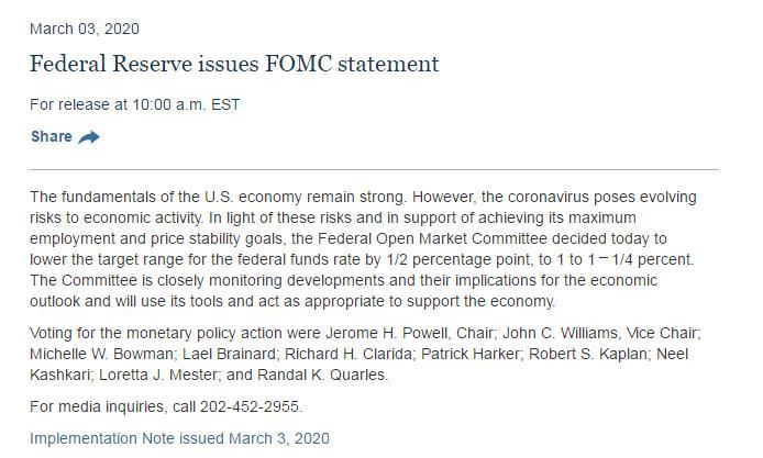 美联储降息声明。 为何降息? 3月3日,美联储宣布大幅降息50个基点,将联邦储备基金利率目标区间降至1%-1.25%。 美联储称,美国经济基本面依然强劲,然而新型冠状病毒给经济活动带来了不断演变的风险。鉴于这些风险,为了支持实现其最大限度的就业和价格稳定目标,决定降息。 美联储表示,正在密切监测事态发展及其对经济前景的影响,并将利用其工具,酌情采取行动支持经济。 这是美联储2020年首次降息。对于此次降息,市场已经有所预期,但其宣布降息的消息是处于美股交易时间,这一点并不寻常。 美联储主席鲍威尔称,降息是为了帮助美国经济保持强劲。美联储认为经济前景面临风险,因此选择采取行动。 将带来哪些影响? 由于降息可以为市场提供更充足的流动性,一般被认为是股市的利好消息。 受到大幅降息的消息影响,当天一路下跌的美股立刻直线上扬,但是持续时间不长,走势震荡。 在上个星期,美股经历了自金融危机以来最糟糕的一周。因为担心不断蔓延的新冠肺炎疫情导致经济放缓,三大股指均下跌超过10%,不过,本周一美股大幅回涨。 鲍威尔称,新冠肺炎疫情的暴发扰乱了许多国家的经济,对经济影响仍然不确定。降息可以避免金融环境收紧,提升家庭和企业信心。 经济合作与发展组织(OECD)近日大幅下调2020年世界经济增长预期,从2.9%调至2.4%。该组织警告,2020年上半年世界经济增长将急剧放缓。 财富证券首席经济学家伍超明认为,美联储降息有助于提振市场对全球第一大经济体经济增长的信心,加上最近全球其他央行也采取降息措施,整体上有助于全球市场信心的恢复,有利于资产价格的稳定和金融风险的平抑,当然也对国内A股构成利好。 前海开源基金首席经济学家杨德龙分析,现在美联储降息,美股有望短期反弹,但是创新高就比较困难了,美股见顶的风险依然很大。 中国央行跟不跟? 在美联储降息之前,澳大利亚央行宣布,为应对新冠肺炎疫情带来的影响,将基准利率下调25个基点,降至0.5%这一历史新低水平。 澳大利亚央行行长菲利普•洛在声明中说,受新冠肺炎疫情影响,2020年上半年全球经济增速将低于此前预期,下调基准利率将有助于推动经济增长。 此次美联储降息后,其他国家央行是否会跟进?中国跟不跟? 七国集团(G7)财政部长和央行行长此前发表声明,承诺使用所有适当的政策工具来实现强劲可持续的增长并防范下行风险。 方正证券称,美联储降息将给中国央行更大的货币政策腾挪空间,预计全球各经济体将再掀起新一轮降息潮,甚至不排除美国再推出量化宽松政策。 伍超明分析,中国央行短期内跟随降息的概率低。因为前期央行针对疫情影响,在流动性供给和利率水平降低等方面出台了不少政策措施,当前要做的是让政策落实到位,并观察政策效果如何,等3月份数据出来后评估能否完成年内的统筹目标,再决定是否降息,所以3月份降息可能性较低,除非有特殊情况。 对于中国未来是否会降准降息的问题,中国央行副行长潘功胜2月7日曾回应称,疫情对中国经济的影响是阶段性的、暂时的,可能会对一季度经济活动造成扰动,但疫情缓解后中国经济将迅速企稳,并出现补偿性恢复。中国货币政策调控空间十分充足,央行正在认真分析和评估疫情对经济的影响,进行政策储备。(完) |
