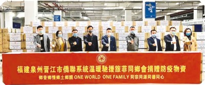 日前,福建省晋江市侨联系统驰援海外防疫物资捐赠活动举行。截至3月31日,晋江市社会各界累计向菲律宾、马来西亚等10个国家(地区)110个社团、同乡会、宗亲会、校友会及友好城市等捐赠口罩436.5万只、防护服18710件、额温枪1543把、连花清瘟胶囊35284盒、现金10000元、橡胶手套2000双、防护眼镜10500个、无创呼吸机5台、消毒水300公斤,总价值1297.09万元。 (照片除署名外均由受访者提供)